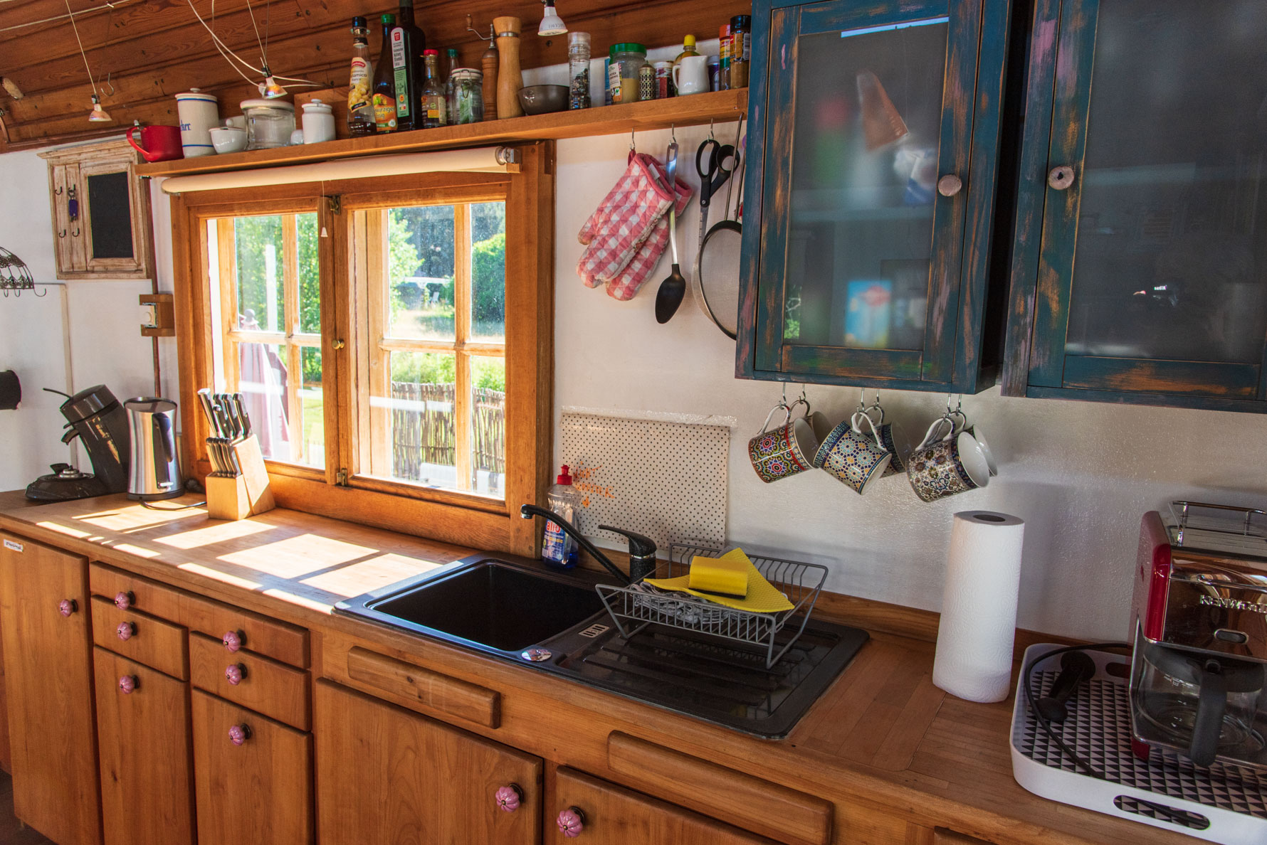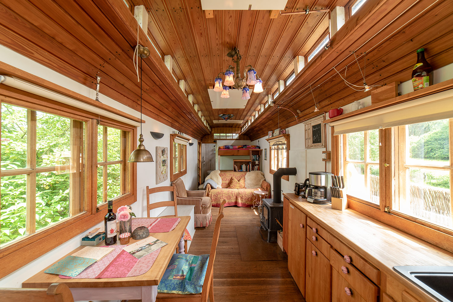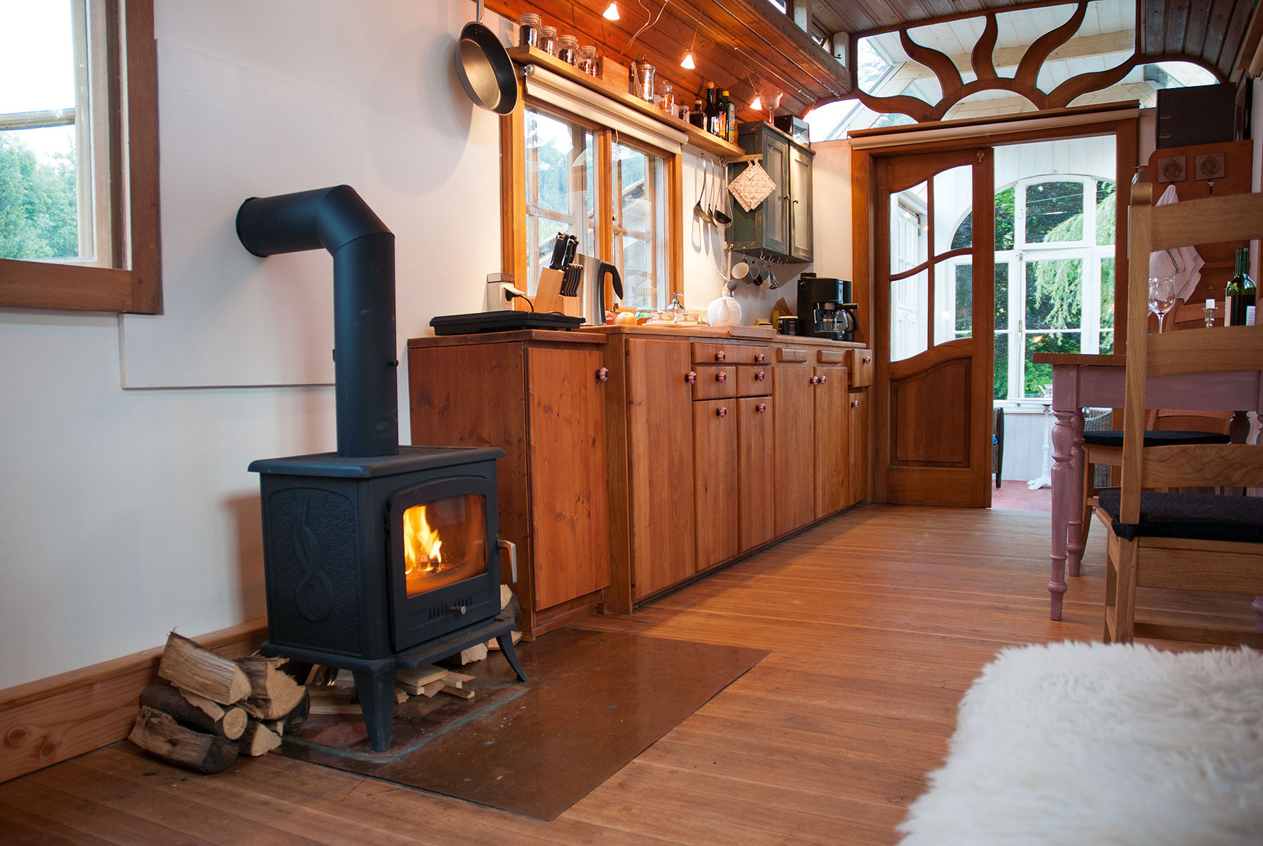 Küchenzeile, Kaminofen, Terrasse