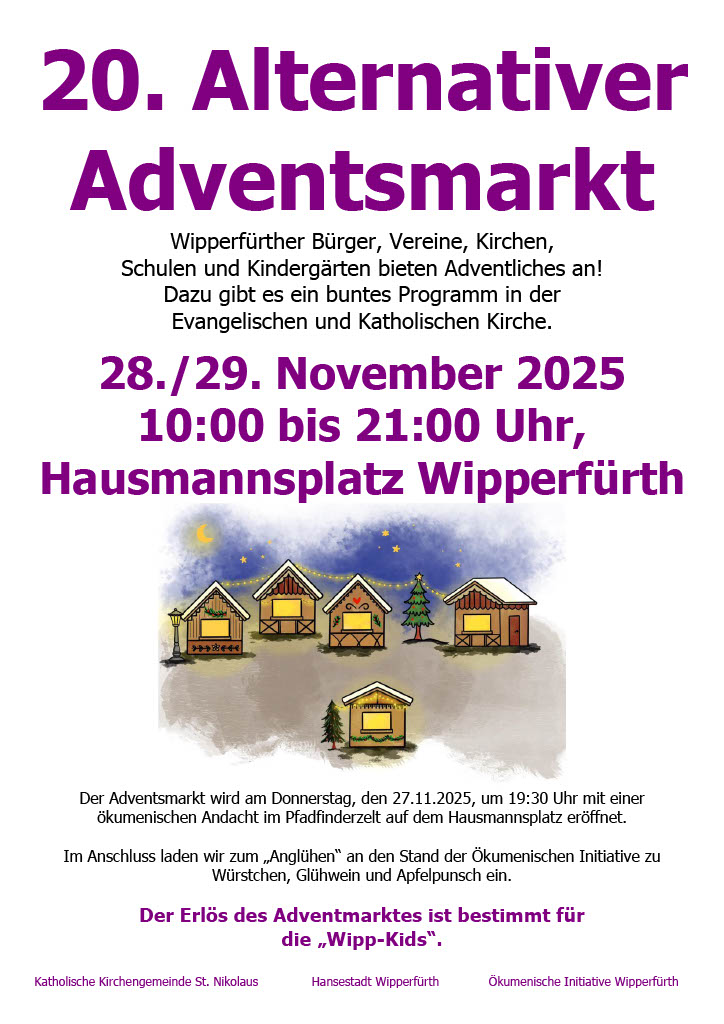 Auf dem Hausmannsplatz neben St. Nikolaus findet der Alternative Adventsmarkt statt. Organisiert von der katholischen Kirchengemeinde St. Nikolaus und der Ökumenischen Alternative Wipperfürth gibt es hier Kunsthandwerk, Stände von gemeinnützigen Vereinen, Schulen oder Kindergärten in Holzbuden und selbst gesungene Adventslieder. Kitsch, Kommerz und Verkauf am Sonntag haben die Organisatoren bewusst verbannt.