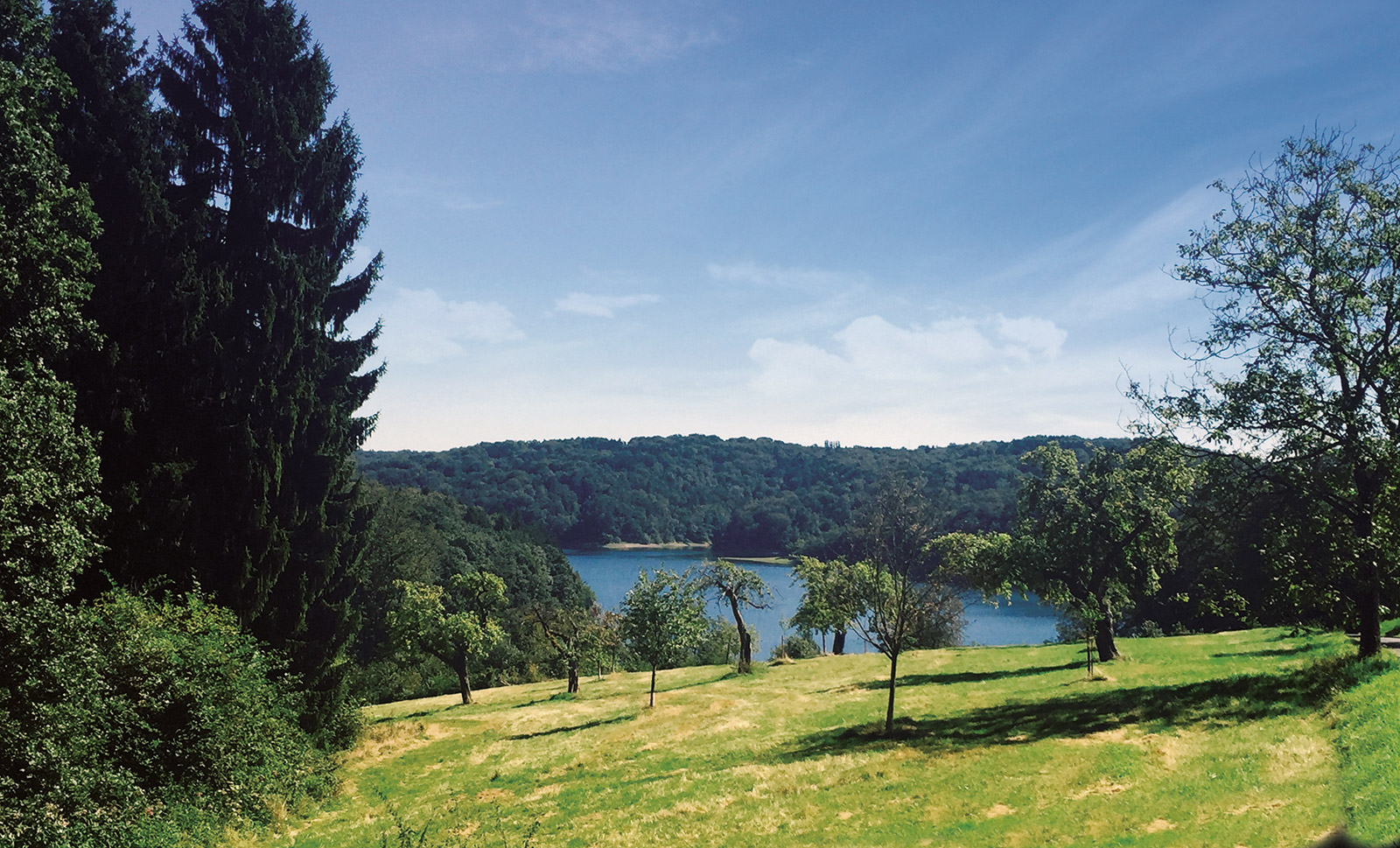 Eure Rundwanderung startet am „Siegelsknippen“ als Waldspaziergang. Ein Forstweg verläuft durch die Stille des Kaldauer Waldes. Die verkehrsarme Seligenthaler Straße führt euch vorbei an der Ruine der im Krieg zerstörten Ummigstalbrücke zur idyllisch gelegenen Klosteranlage. Erhalten ist die im 13. Jh. erbaute Klosterkirche (älteste Franziskanerkirche in Deutschland) und eine barocke Kapelle. Die ehemalige Klosteranlage wird heute als Eventhotel genutzt. Durch das Tal setzt sich der Weg teils auf schmaleren Waldwegen fort, von Zeit zu Zeit begleitet euch Richtung Talsperre der muntere Wahnbach. Es folgt ein steiler, wenn auch kurzer Wurzelpfad zum Höhenkamm. Oben angelangt, belohnt ihr euch mit dem grandiosen Ausblick von der Staumauer auf die tiefblaue Wasserfläche für die Anstrengungen. Auf einem kurvigen Straßenabschnitt bergauf geht es an Feld und Obstwiesen vorbei zu Gut Umschoß. Unterhalb des Guts findet ihr auf einer Wiese bequeme Liegebänke mit Seeblick. Nach einer Passage durch eine wunderschöne Nussbaum-Allee erwartet euch noch ein Naturdenkmal: eine alte Rotbuche mit enormem Umfang. Ein Pfad durchs Ummigsbachtal, der mehrfach das Bächlein quert und Teiche passiert, führt durch den Wald zurück zum Ausgangspunkt.