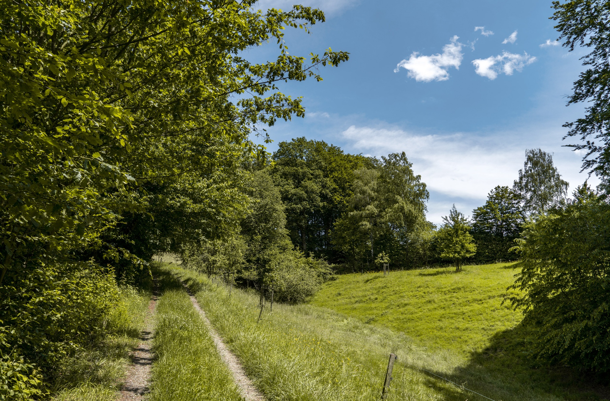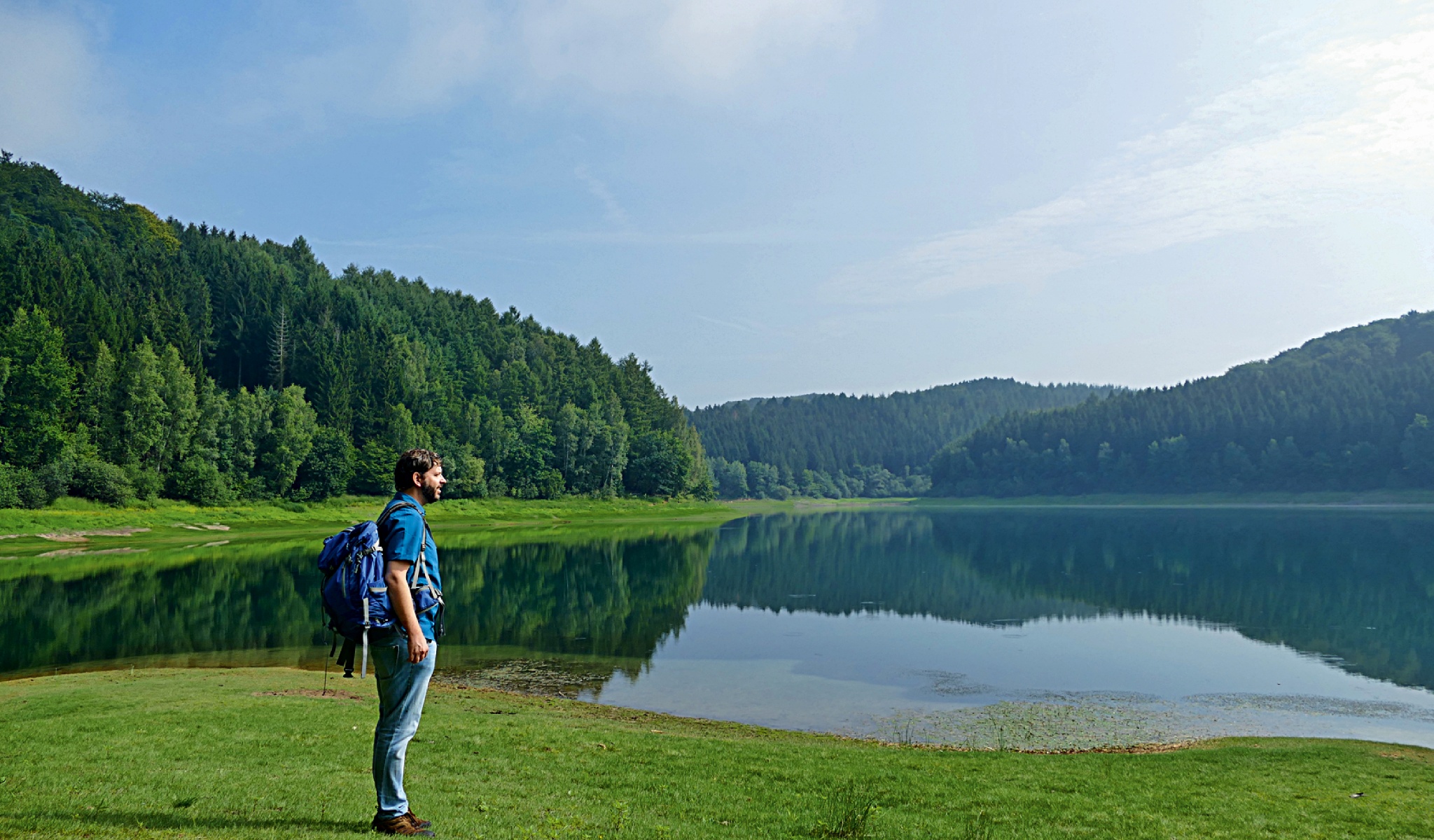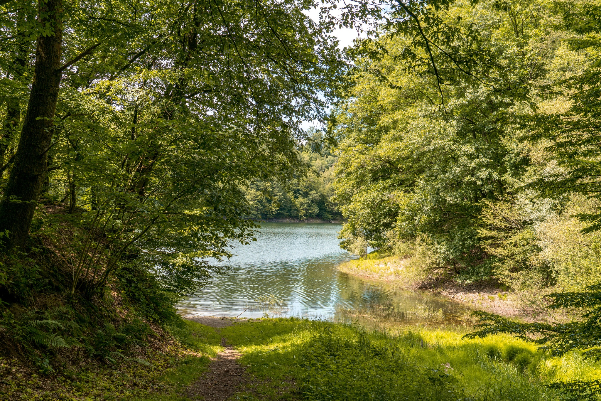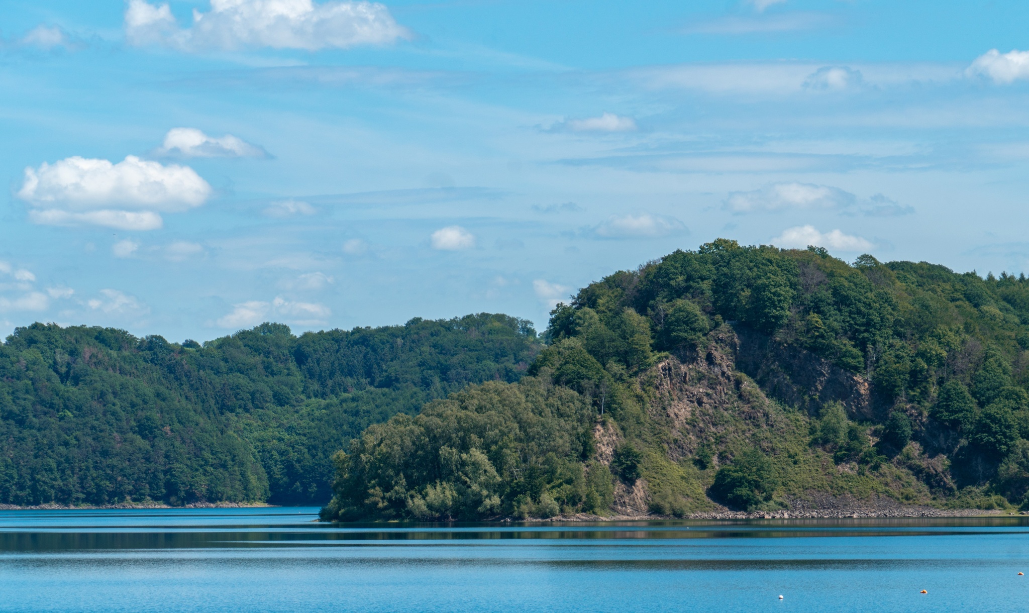 Die über 20 Kilometer lange Route ist wegen ihrer teils sehr schmalen Trampelpfade und dem stetigen Auf und Ab auch für geübte Wanderer eine Herausforderung! Am Staudamm habt ihr eventuell nochmal Gelegenheit, eure Trinkflaschen mit frisch aufbereitetem Talsperrenwasser zu füllen. Nach der Überquerung der Staumauer startet der Weg den Berg hinauf. Zuerst führt euch ein Waldpfad an Bäumen und Wiesen von Happerschoß vorbei, dann geht es zurück in den Wald: Unter großen Bäumen erreicht ihr ein erstes Bachtal. Zwei Bachüberquerungen später führt euch die Route nun wieder bergauf ins malerische Fachwerkdorf Pinn. Naturnahe Pfade weisen den Weg talwärts, unterwegs genießt ihr bei einer Hütte am Aussichtspunkt Ringelstein den Blick über das klare Wasser des Stausees. Im Anschluss führt der Weg Richtung Wolperath, von wo aus bereits die Vorbecken der Talsperre zu sehen sind. Nach dem Überqueren des nördlichen Ausläufers der Talsperre führt ein Pfad über einen schmalen Grat zwischen lichten Eichen und Kiefern auf die Westseite. Hier windet sich der Weg weiter um die zahlreichen Zuflüsse und quert häufig enge Kerbtäler. Auf Höhe der Ortschaft Schneffelrath verlasst ihr den Uferbereich der Talsperre. Nach der Querung des Derenbachtals führt eine ruhige Asphaltstraße durch eine beschauliche Nussbaum-Allee Richtung Gut Umschoß. Unterhalb des Guts bietet sich auf einer alten Obstwiese Gelegenheit für einen schönen Ausklang auf Wanderliegen mit „Seeblick“.